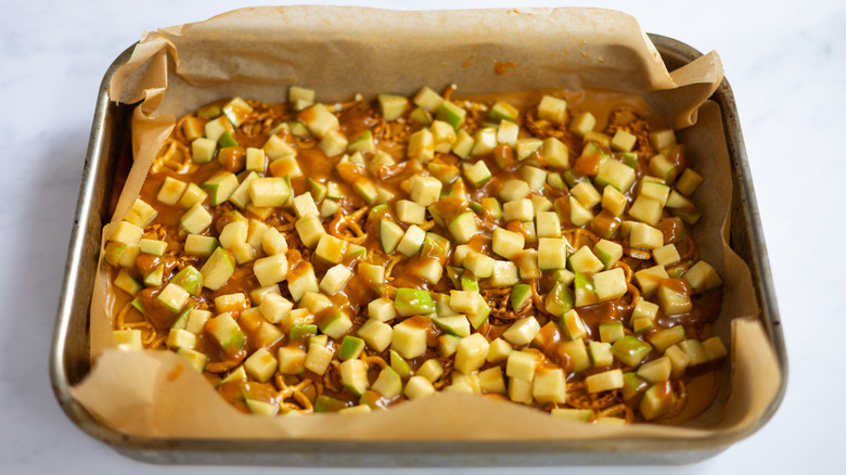 If you're eager to switch up the toppings on your salted caramel and toasted white chocolate apple bark, there are a variety of tantalizing toppings that can add an different layer of flavor and texture. Douglas says, "A sprinkling chopped nuts like toasted almonds, pecans, or hazelnuts for a delightful crunch that contrasts beautifully with the smoothness of the bark. Alternatively, a dusting of finely shredded coconut can add a subtle tropical sweetness. For a burst of color and tanginess, dried cranberries or cherries can be scattered on top of the chocolate, for a sweet fruitiness."