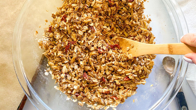 If you'd like to customize your gingerbread granola even further, you have a few options. Gingerbread today typically refers to a dessert made with ginger and molasses, so you'll want to have those basic elements in place to nail down the classic flavor, although you can add in any other festive ingredients you like. Swap or add nutmeg into your array of spices, or include a teaspoon of salt to amplify the sweet and salty juxtaposition. Pour in diced candied ginger to enhance the ginger flavor even more, and for extra sweetness and texture, use chopped dried apricots or golden raisins. Although molasses is the classic sweetener here, you can sub it out for honey or maple syrup if you like the flavor better — but as long as the ginger is in there, you're on your way to a festive Christmas breakfast.