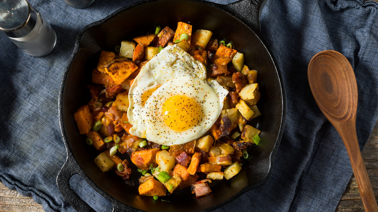 Tasty sweet potato hash and fried eggs is a scrumptious idea for breakfast. You'll need to cube hole or sliced canned sweet potatoes for this dish. Once you season them, you can add other ingredients like bacon, ham, onion, broccoli, bell pepper, or any veggies from your fridge for additional protein, color, and nutrients. It's the ideal way to finish up ingredients that would otherwise go bad like the bagged spinach that's nearing its use-by date, or that half an onion hidden behind last night's leftovers. You can truly get creative with the add-ins.