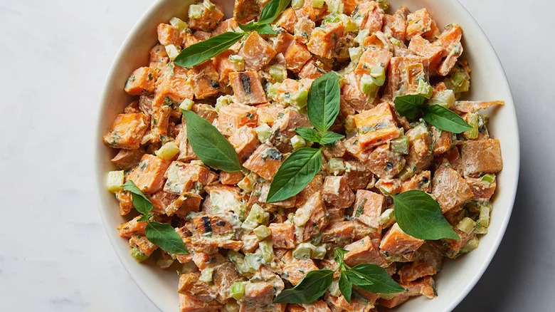 The awesome thing about sweet potato salad is that you could make your own regular potato salad recipe and just swap out the potatoes for sweet potatoes. You can mix things up by adding celery, peas, pickles, or whatever you like to include. This dish is absolutely packed with deliciousness that everyone will rave about. There's nothing boring about a sweet potato salad.