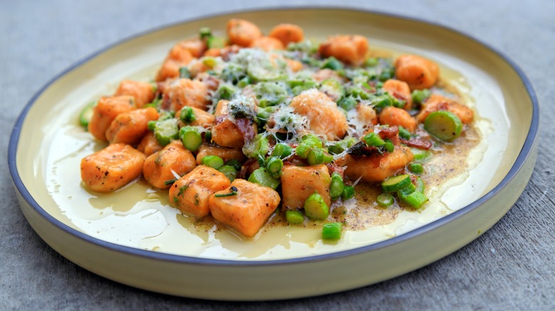 Homemade pasta of any kind feels so comforting, like a warm embrace with every bite, and you can make colorful sweet potato gnocchi at home without a lot of ingredients or fancy pasta-making equipment. The trick is to get whole or sliced canned sweet potatoes and put them in a ricer; this is the key to getting the correct texture for your gnocchi. Gnocchi is the perfect beginner pasta since the cooking process only takes a couple of minutes and the shape doesn't have to be perfect. Serve your sweet potato gnocchi with lemon ricotta, prosciutto, asparagus, or freshly grated Parmesan.