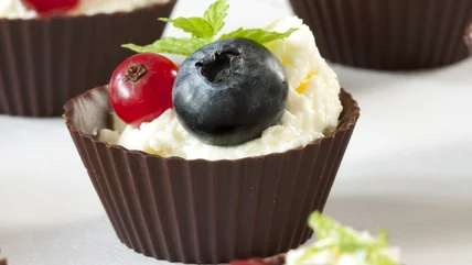 Because you're using muffin tins or liners, the most obvious filling for a chocolate dessert bowl would be a muffin or cupcake: After popping fresh muffins out of the silicone tins, you can then turn those tins into molds for your edible muffin liners. A dark chocolate muffin shell would taste delicious with an orange-cranberry muffin.