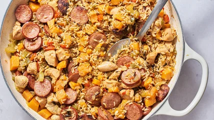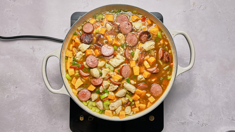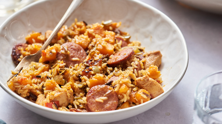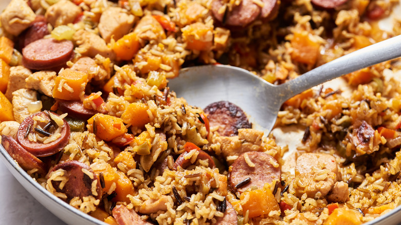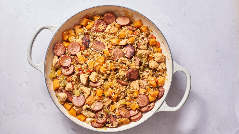A perfect addition to jambalaya, believe it or not, is sweet potato, a tuber not usually considered for the peppery dish. Adding sweet potato transforms jambalaya into an autumnal affair with a nutty, savory flavor and the same, mellow heat. Recipe developer Michelle McGlinn also swaps the rice for wild rice to lean into the fall-forward flavors, making this jambalaya a flavorful treat for cold-weather gatherings. The best part is that this Cajun jambalaya is still made in one pot, so it's perfect for easy, weeknight dinners.