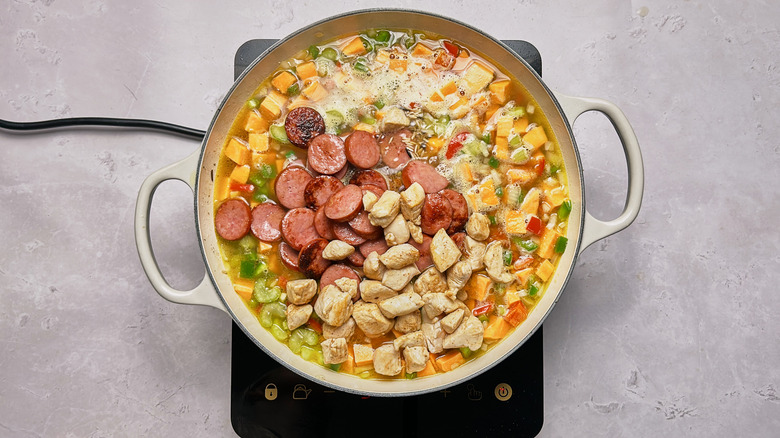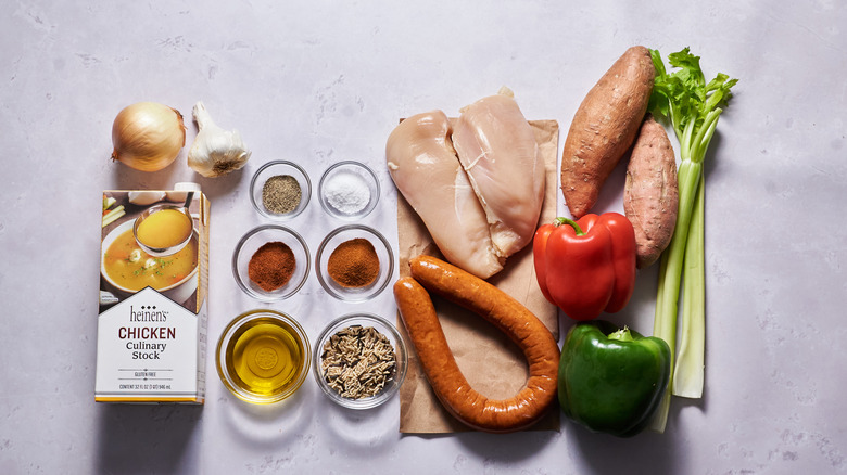 The proteins you'll need for this jambalaya are chicken breast and Andouille sausage. If you can't find Andouille (or want a milder version), try smoked sausage or kielbasa instead. You'll also need a few pantry staples — olive oil, salt, and pepper. Next, gather the ingredients for a Cajun holy trinity — onion, celery, and bell pepper — as well as garlic and sweet potatoes. To complete the jambalaya from there, you'll just need chicken stock, smoked paprika, cayenne, and wild rice. Wild rice is sold on its own (black grains) or as a mix with brown or white rice. We recommend choosing a mix so that your jambalaya has some color.