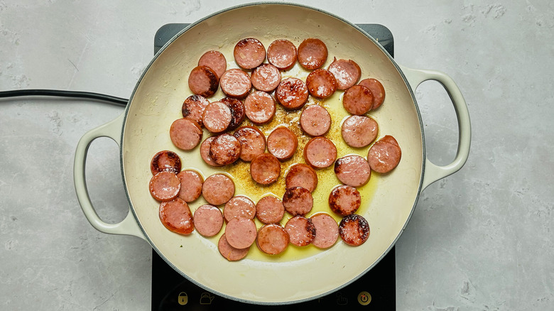 - Add Andouille and cook until deeply browned, about 5–8 minutes.