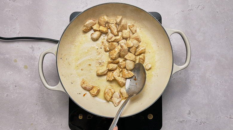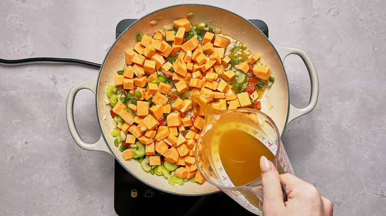 - Add the sweet potatoes, then cover with chicken stock, scraping the browned bits from the bottom of the pot.