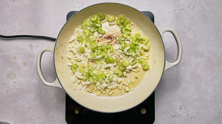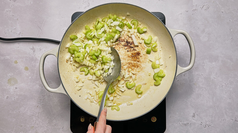- Add the celery, garlic, and onion, adding more oil if needed.