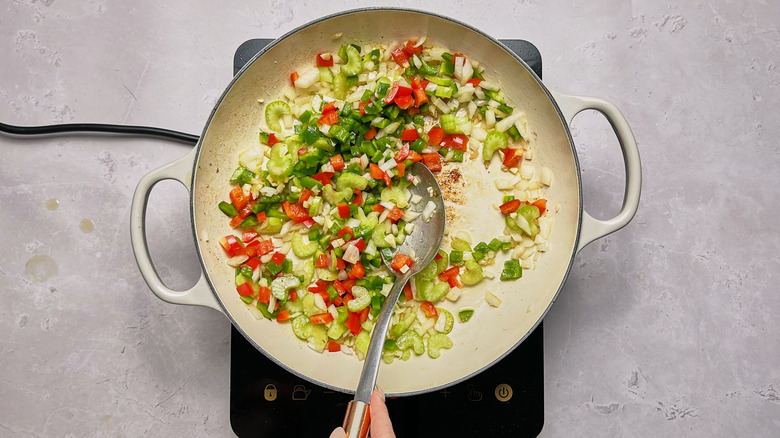Jambalaya is a staple of Cajun and Creole cuisine, a regular dish on menus and dinner plates in southern Louisiana only rivaled by roux-heavy gumbo. Though each family may have their own secrets, jambalaya always follows a familiar blueprint: spicy Andouille, tender chicken, juicy shrimp, bell peppers, and a whole lot of rice. If the jambalaya is Creole, it's filled with tomatoes, too, and if it's Cajun, the tomatoes are left out for a meat-focused dish. Cajun or Creole, jambalaya has fed hungry Louisianians for decades using the vegetables of the bayou.
