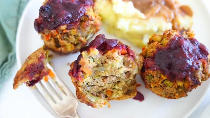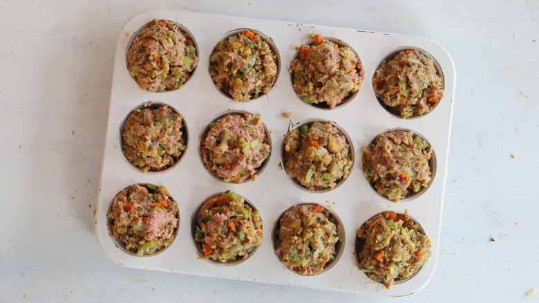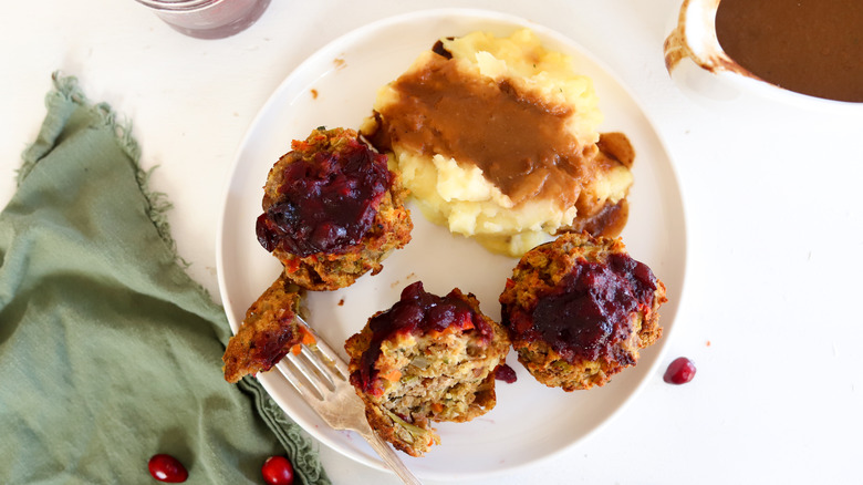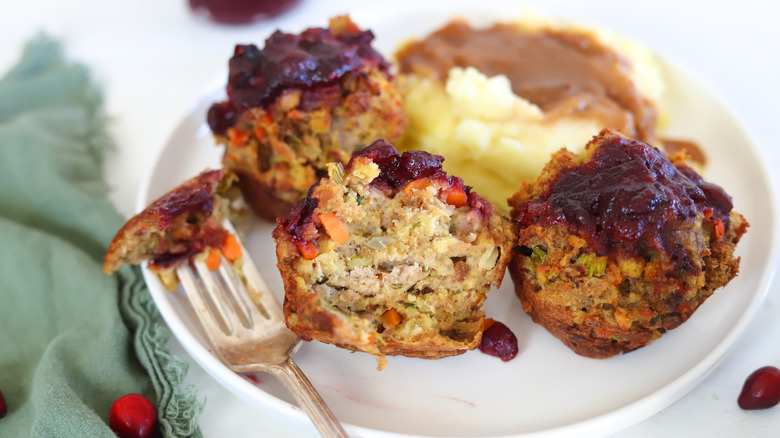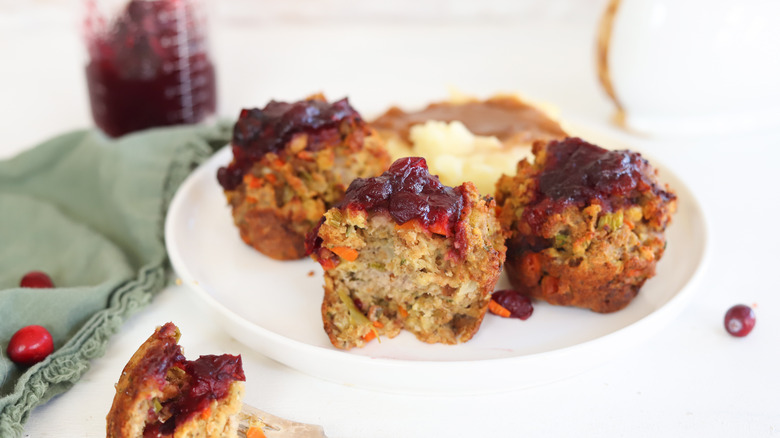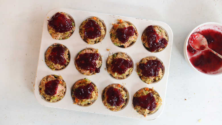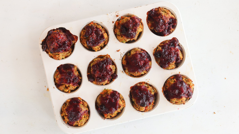 Recipe developer Leah Maroney brings us this dish, and she loves the simplicity of the recipe: "Everything mixes together in one bowl and is cooked in one muffin tin. Since it includes turkey, stuffing, and cranberry sauce ... It's a complete meal in a little muffin." However, we highly recommend serving these with mashed potatoes and gravy, because why not? Since there aren't any pan drippings, you can use the pan that was used to soften the vegetables. Or, just use store-bought gravy to save time. Maroney uses a thinner cranberry sauce here, but you can also use jellied cranberry sauce. Just thin the cranberry sauce with a little water to form a spreadable sauce for the top of the muffins.