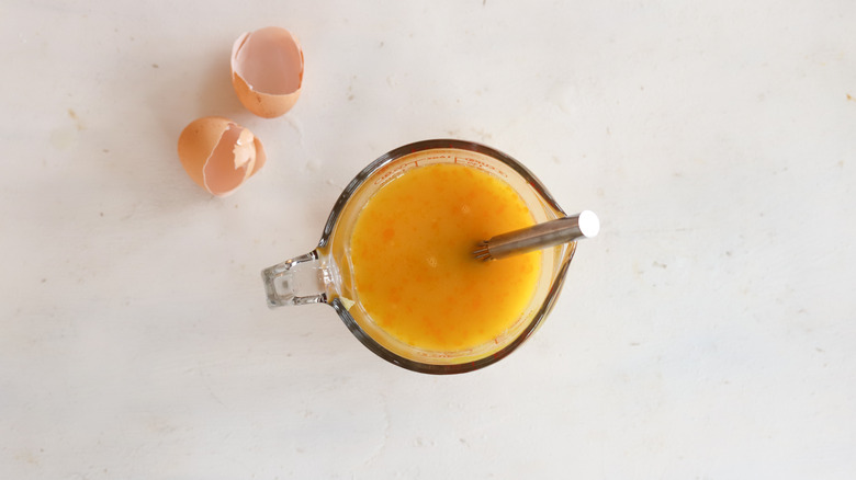 - Add the dried seasonings, chicken broth, and eggs to a measuring cup and whisk to combine.