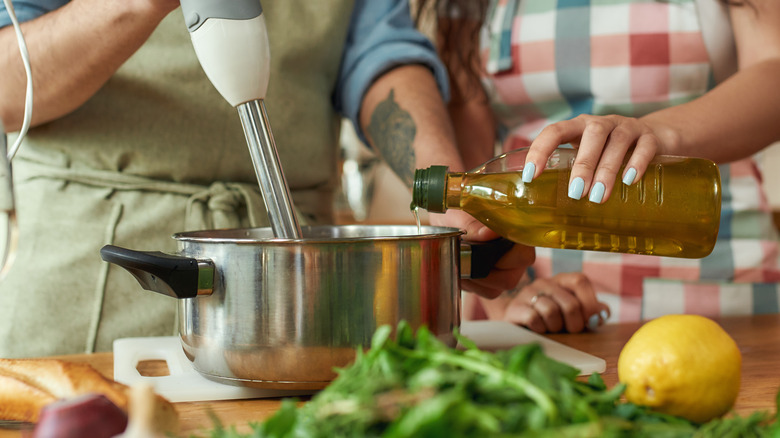 There are a few different ways you can puree part of your broccoli cheddar soup depending on which device you want to use. Since you're not pureeing the whole pot, the easiest method may be to transfer the portion you want to pulverize into a full-size blender. Try to get as many potato chunks as possible in there so you can get all the creamy benefits of the starchy spuds. You'll want to do this step after you're almost completely done with the soup — after you've stirred in all the ingredients and allowed the soup to simmer. Once your spoonfuls are pureed, you can simply pour them back into the pot, stir, and allow everything to reheat together for a minute or two before serving.
