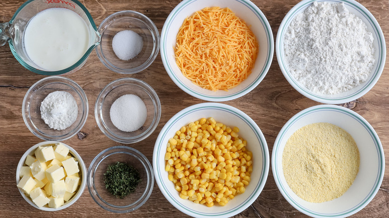 You'll need both all-purpose flour and cornmeal to make up the bulk of these biscuits, along with baking powder, sugar, salt, and cold, cubed butter. Sharp cheddar cheese, sweet corn, and fresh thyme add flavor to these biscuits, and the last ingredient you'll need to tie everything together is buttermilk.