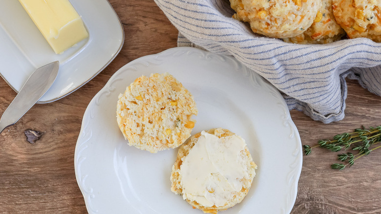 Adding to the easy aspect of these homemade biscuits, Morone explains, "Since they are drop biscuits, you don't have to roll the dough out and cut it, so this recipe is so quick and easy." Your tasty corn biscuits will also feature hints of cheddar cheese and fresh thyme, making for a savory baked good that is incredibly simple yet highly delicious and versatile. Enjoy one of these biscuits for breakfast, as a snack, or even use it as an upgraded base for biscuits and gravy.