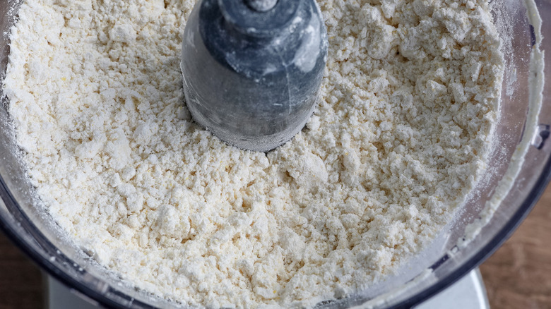 - Add the cubed butter and pulse until the mixture is crumbly and resembles coarse sand.