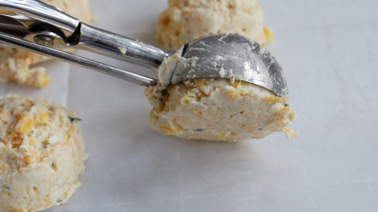 - Use a large cookie scoop (about 2 ½ tablespoons) to drop the dough onto parchment-lined baking sheets, spacing the biscuits at least 2 inches apart.