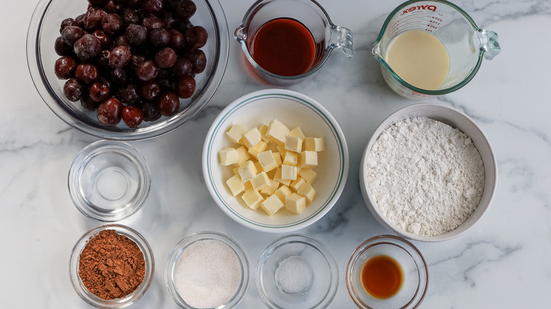 To make the chocolaty crust, you'll need cocoa powder, flour, a stick of butter, salt, sugar, and cold water. For the filling, you'll need cherries — with their pits removed, of course. "I used pitted frozen sweet cherries that were thawed completely and drained. Fresh cherries also work great in this," Morone explains. "You can also use a combination of sweet and tart cherries if you prefer a more tart cherry pie." Though Morone doesn't recommend canned cherries, she says you can use them if they're canned in water rather than syrup. Lastly, the filling also calls for pomegranate juice, sweetened condensed milk, vanilla extract, salt, and sugar.
