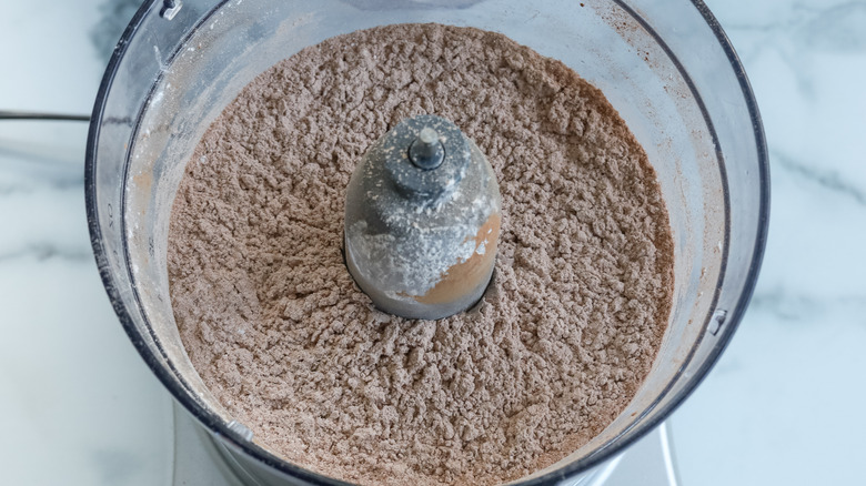 - To make the pie crust, add the flour, cocoa powder, sugar, and salt to the bowl of a food processor. Pulse for a few seconds until well combined.