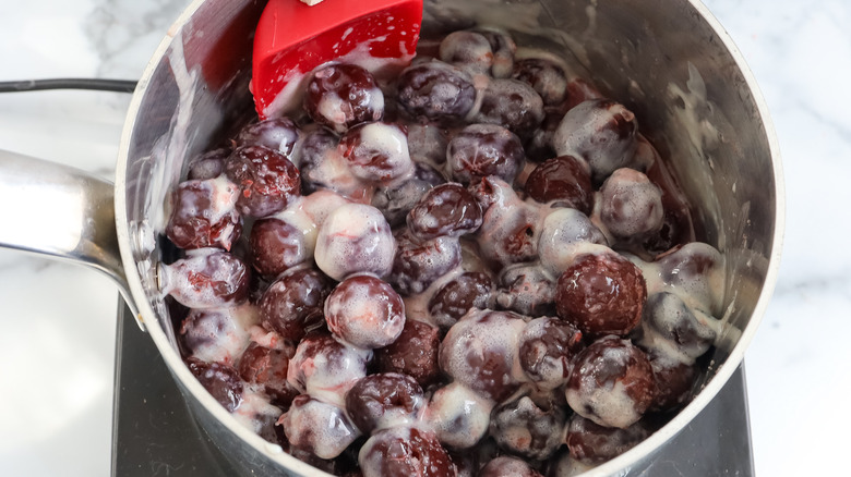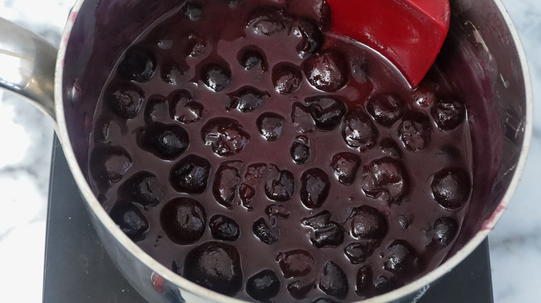 - Bring to a boil, then reduce heat to a simmer and cook until the cherries begin to break down and the mixture begins to thicken, about 10 minutes. Remove from heat and allow to cool completely.