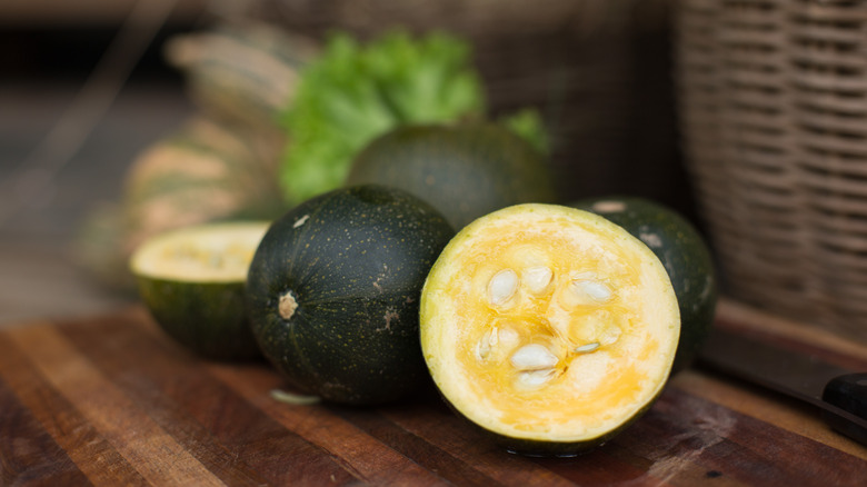 Now, while bottle gourds have grown in Africa for millennia, they were often historically used for storage rather than eating. Eventually, gourds were cultivated in Africa (and in Central and South America) to produce fleshier, less bitter fruits designed to be eaten. The gem squash, for instance — small, round, and green — is popular in South Africa. With smooth skin and orange flesh, this squash can be steamed and eaten whole (skins and seeds included) when young — though mature gem squashes should be peeled. This squash can also be halved and roasted, and served stuffed like an acorn squash.