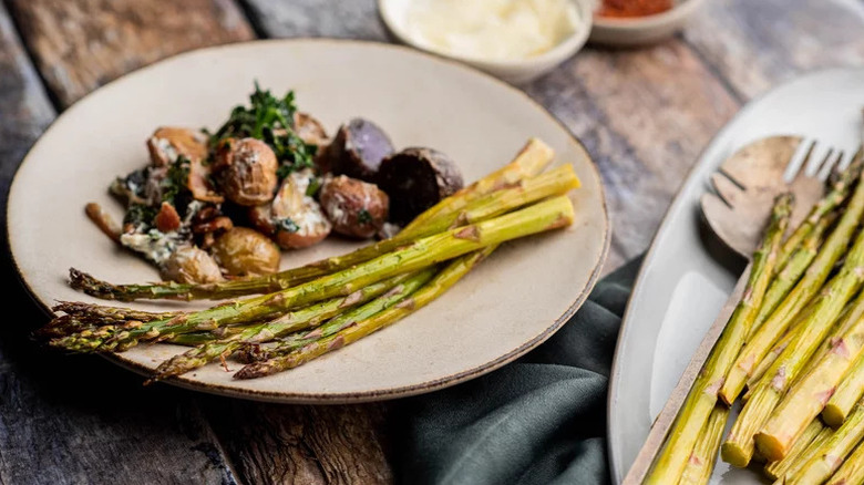 Cooking asparagus doesn't have to be a complicated endeavor, especially when you decide to roast it, which makes for an easy-to-manage side dish while you're prepping your lasagna. This recipe calls for just a few ingredients other than the asparagus.