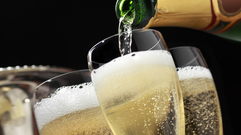 Champagne and wedding cake were made for one another — well, sort of. Festive and fancy as the French bubbly may be, not all Champagne is made the same. Given that the sparkling wine can be crafted in a range of styles, it's wise to familiarize yourself with different iterations before selecting which bottles to serve on your special day. Although there's a suitable Champagne for every moment of a wedding, when it comes to the dessert course, bypass the brut.