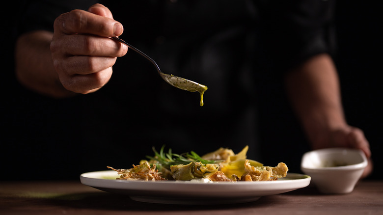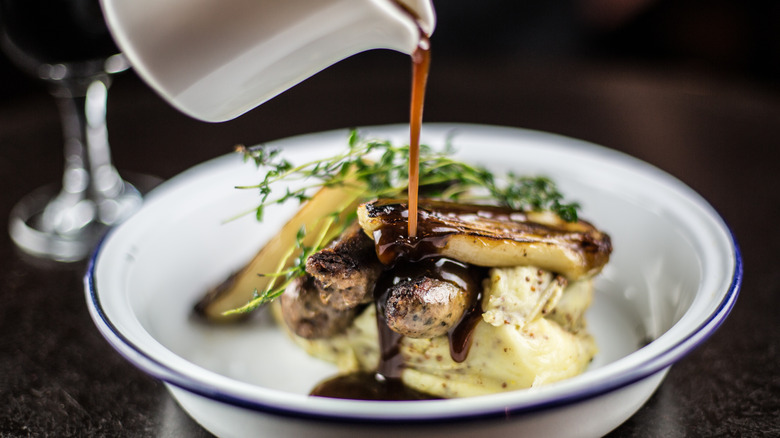 Although you're at liberty to spend time reducing and whisking glazes and compotes, pan sauces aren't actually that complicated or time-consuming to whip up. In a pinch, mixing together a few condiments can even produce some pretty spectacular dressings. The tricky part is knowing how to best showcase them. Despite that they can be a welcomed addition to lean or overcooked proteins, they really sing with a hearty (and starchy!) side.