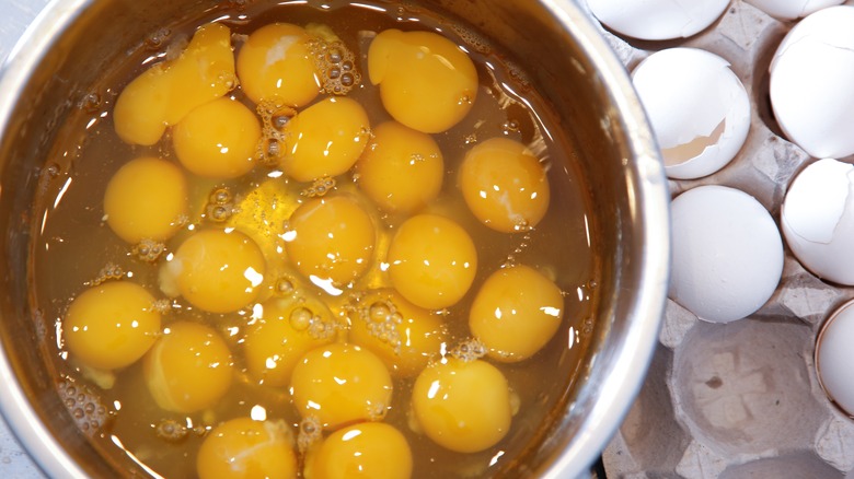 But it's not all doom and gloom. Thankfully, it's fairly easy to prepare an egg yolk for freezing. Here's the trick: whisk ¼ cup of egg yolks (about four yolks) with either ⅛ teaspoon of salt (for savory dishes) or 1½ teaspoons of sugar (for sweet dishes). Pour the mixture into a container with a snug lid, ensuring you label the number of yolks, the date, and whether you added salt or sugar. Freeze for up to four months, then thaw overnight in the refrigerator. While the texture won't be an exact match to its pre-freeze state, this technique ensures you can still make the most of your frozen egg yolks.