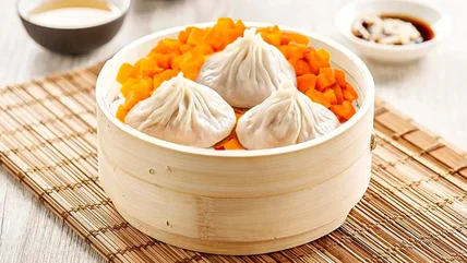 To start steaming frozen dumplings, like soup dumplings, on top of vegetables, first arrange a layer of your leafy greens, such as cabbage or bok choy leaves, at the bottom of a bamboo steamer. Alternatively, like a cute orange perch, you can create a bed of thinly sliced carrots, preferably one slice for each dumpling. These vegetables should be spread evenly to cover the steamer's surface, providing a natural, non-stick layer. Next, place your frozen xiao long bao or soup dumplings atop this vegetable layer, ensuring they have enough space between them for even cooking.