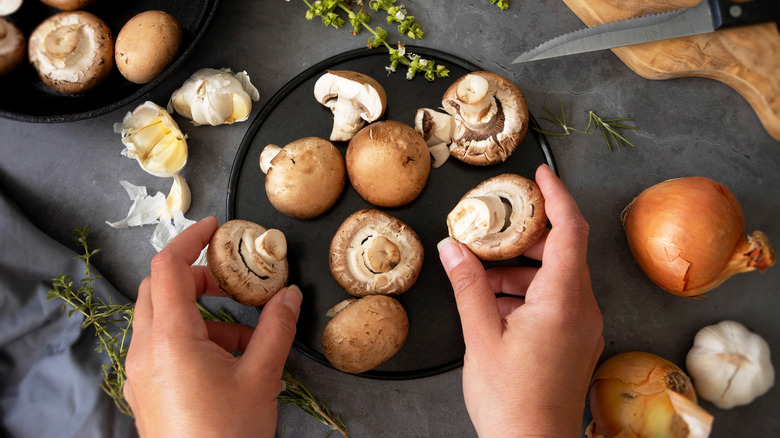 To swap out the meat in meatloaf for a vegetarian mushroom version, you'll first need to chop up your fungi. Luckily, almost any type of shrooms will do here — so whether you prefer cremini, white button, shiitake, or something else, you can throw them (or a mixture of a few types) in your recipe. The key to squeezing even more flavor out of these fungi is to caramelize them on the stovetop with your onions, which will add sweetness and enhance the flavor even more. For an easier recipe, you can skip this step and simply pulverize the mushrooms in a food processor with your onions and garlic, but the depth of flavor won't quite be the same. After either method, you can then add in the rest of your ingredients, like the ketchup, herbs, and Worcestershire sauce.