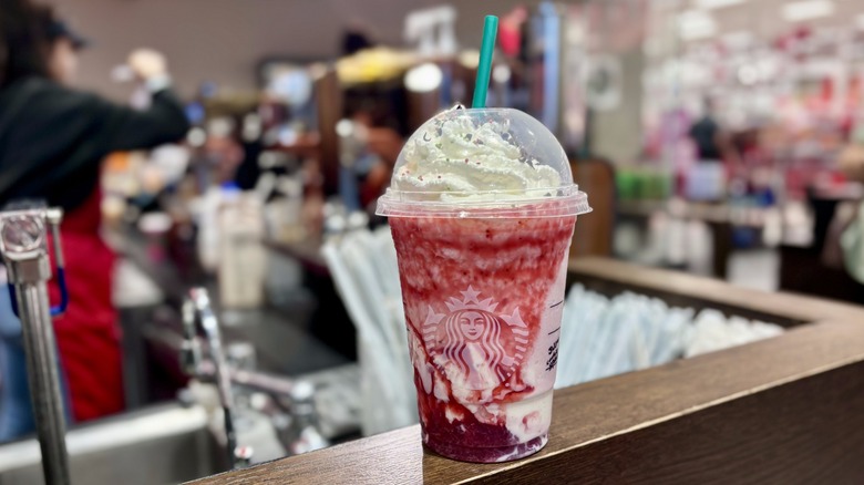 For an extra visual flair, ask your barista to line the cup with either mocha drizzle or strawberry puree. We chose mocha to enhance the chocolatey taste. On top of the whipped cream, request a bit of matcha powder and a sprinkle of chocolate curls. The drink ends up reminiscent of a minty chocolate chip shake, a flavor we didn't expect, but the peppermint really shines through. The chocolate line in the cup and the chocolate curls on top further accentuate the overall chocolate taste.