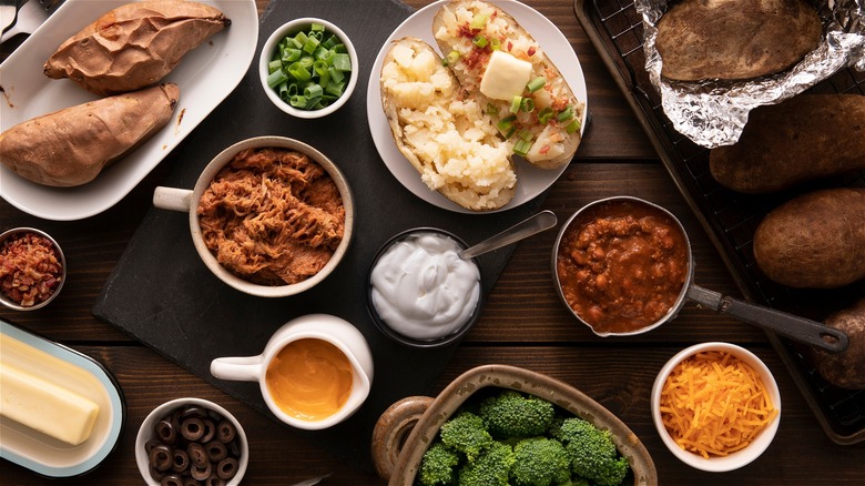 Veggies, like chopped raw onions, olives, broccoli, grilled onions and peppers, pickled jalapenos, and charred corn, are all welcome additions. Hearty toppings like chili and pulled pork make sure folks won't be hungry, and those who don't want a potato can top a bowl of chili instead. You can keep the whole thing simple with Russet potatoes or include some baked sweet potatoes for those with a sweet tooth.