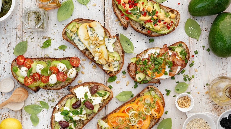 For the best bruschetta bar, make sure there are plenty of spreadable components, such as tapenade, hummus, softened goat cheese, or pesto. For toppings, provide a selection of ingredients with contrasting colors and flavors, like cherry tomatoes, kalamata olives, and avocado slices. Salty meats and creamy cheeses are must-haves. Don't forget the finishing touches. Sea salt, chopped nuts, poppy seeds, and fresh herbs make everything look even more delicious while also amping the flavors.