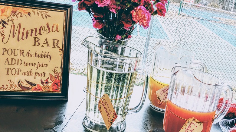 Break out your prettiest stemware, plus some pitchers or carafes for the juices. Good mimosa bar selections include fresh orange juice, cranberry juice, pineapple juice, homemade lemonade, mango juice, and pear nectar. Slices or chunks of fruit can include peaches, kiwis, strawberries, or whatever is pretty and in season. Consider popping small berries like blackberries and raspberries in the freezer, and they'll help keep drinks cool while also looking beautiful.