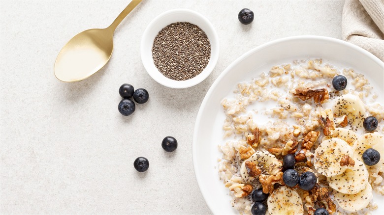 For toppings, provide choices of sweetener (white sugar, brown sugar, and at least one sugar substitute), butter, milk (with at least one non-dairy option), and cinnamon as the basics. Selections of fresh fruit and nuts allow for further customization. Don't forget chia seeds and flax for those who want extra fiber. Peanut butter, jellies, jams, and sprinkles will be popular toppings with the kids.