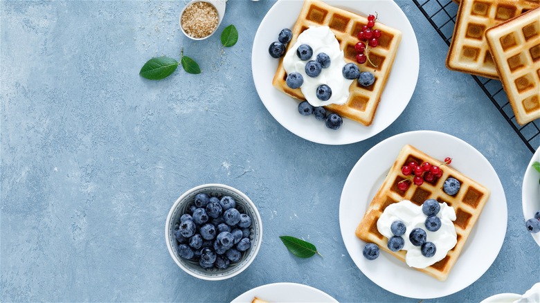 Fresh fruit, whipped cream, butter, and a selection of syrups are popular waffle toppings you should have on hand, but don't forget those who prefer a savory dish. Chicken tenders would be an appreciated addition to a waffle bar for those who like chicken and waffles. Consider adding a spicy hot honey as a topping option. Cheese, bacon, and green onions make great savory waffle toppings, too. If you're up for scrambling some eggs, some of your guests might like making a waffle breakfast sandwich.