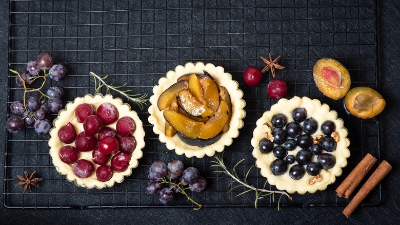 From plain tarts to intricately folded crusts, pies are the perfect canvas for professional and aspiring bakers alike to experiment with culinary appeal. Instead of having to worry about a complex garnish or a complicated powdered sugar design, fruit can help chefs create presentable designs with ease. Simply reach for the fruit that is in season, and slice pieces accordingly to match the overall composition of your pie. Add fresh herbs — think springs of rosemary and mint — to build even more contrast in color and texture on the surface of your baked goods. This quick hack can instantly elevate the appearance of any pie.