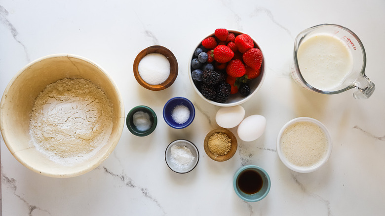 The ingredients for this recipe are not too different from any basic pancake recipe. Flour, sugar, salt, baking powder, and baking soda make up the dry ingredients. For moisture and flavor, there is buttermilk, melted butter, and a hint of vanilla extract, plus a few eggs to give the pancakes density and lift. The special ingredient, the roasted berries, starts with a mixture of whatever berries you can find. We used a combination of strawberries, raspberries, blackberries, and blueberries, but you can feel free to substitute for some or just one of these berries if you wish. We toss the berries in a maple sugar to add an extra dose of maple flavor, but plain white sugar or brown sugar will work here as well.