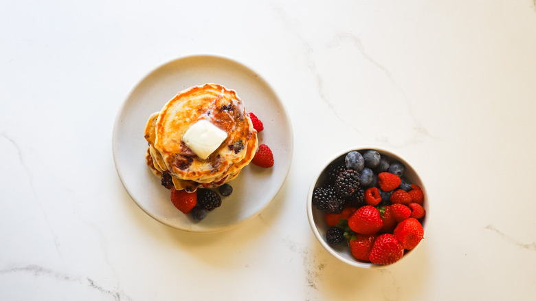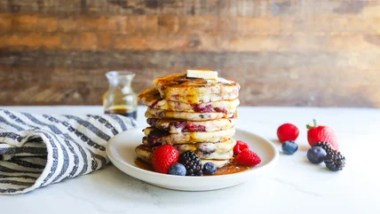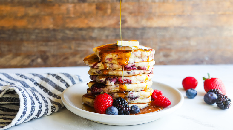 These luscious buttermilk pancakes feature a medley of maple syrup-coated berries.