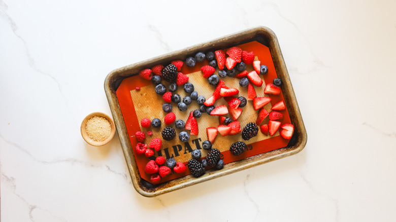 - On a rimmed baking sheet, combine the berries with maple sugar and toss to coat.