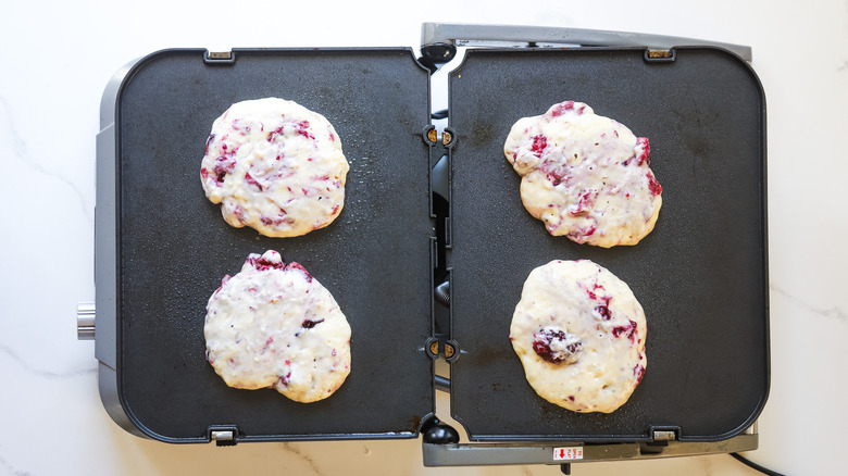 Scoop ½ cup of pancake batter onto the griddle. Cook until golden brown on one side then flip. Continue to cook until browned on both sides and cooked in the middle.