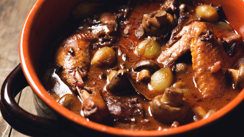 Decadent, savory, and packed with hearty umami, coq au vin, or "chicken with wine," is already the perfect dish for the wintertime and fits Kristen Kish's classification as similar to a "savory tea." But as she noted, if you want to try your hand at making coq au vin or a similar dish, you'll need to have some time on your hands. Coq au vin involves chicken cooking down for long periods of time at low temperatures in a broth of bacon, mushrooms, and red wine. While it's not particularly labor-intensive, there are still a few things to keep in mind to make yours the best it can be.