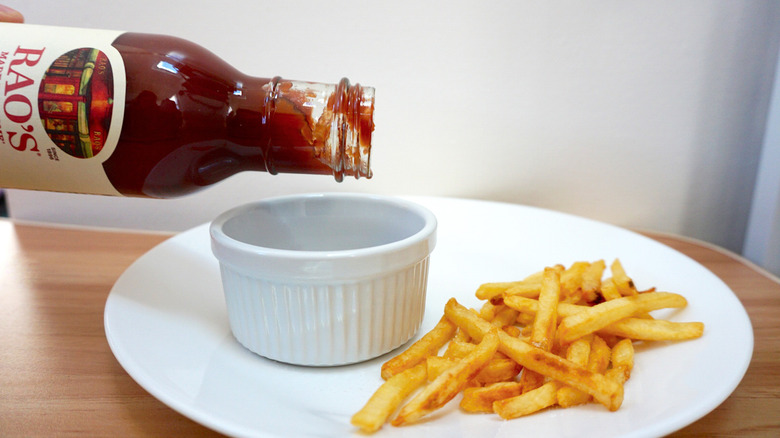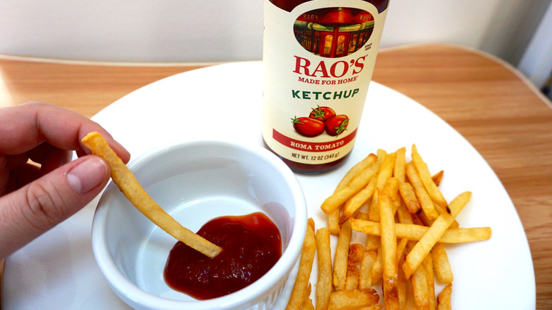 According to the company, the Rao's brand plans to expand its ketchup reach to more stores in the future, including HEB, The Fresh Market, and Wakefern. But for now, to try the condiment, you'll have to pop on over to your local Whole Foods Market. If you're not sure whether or not you're going to like Rao's ketchup, or if you're willing to shell out the money for one of the bottles (more on that in a minute), keep on reading to see our thoughts about the ketchup bottles, including what flavor we liked best and ways we think you'd be able to creatively make the most of your ketchup bottles outside of as dipping sauces for french fries.