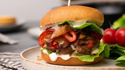 This burger-fajita hybrid is packed full of flavor, with fajita seasoning and chili adding a good dose of spicy heat. Paired with sauteed red peppers and onions, and a zingy sour cream, lime, garlic, and cilantro sauce, this burger is served up in a soft burger bun with melted cheddar cheese and crunchy lettuce leaves — it might just be the perfect burger for those who love Tex-Mex flavors, and it's certainly more exciting than your typical cheese-topped burger.