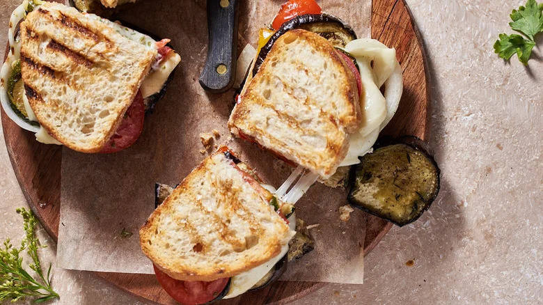 It is well-established that cheese is a good filling for a sandwich. In some cases, it might be the only filling a sandwich needs. That said, we're all about going above and beyond with food, hence our Ratatouille-ish eggplant panini with herb aioli recipe, which includes a healthy dose of mozzarella. However, it also brings a ton of veggies: roasted eggplant, zucchini, and bell peppers.