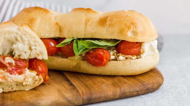 To make this sandwich, you will want to roast most of the ingredients (hence the name) except the cheese. While this recipe calls for burrata, mozzarella makes a great substitute. Indeed, mozzarella, not burrata — which is creamier and tends to fall apart more readily than its counterpart — is the star cheese in Caprese salads, making mozzarella a more appropriate choice for this recipe. At least, it is if we want to stay true to the title.