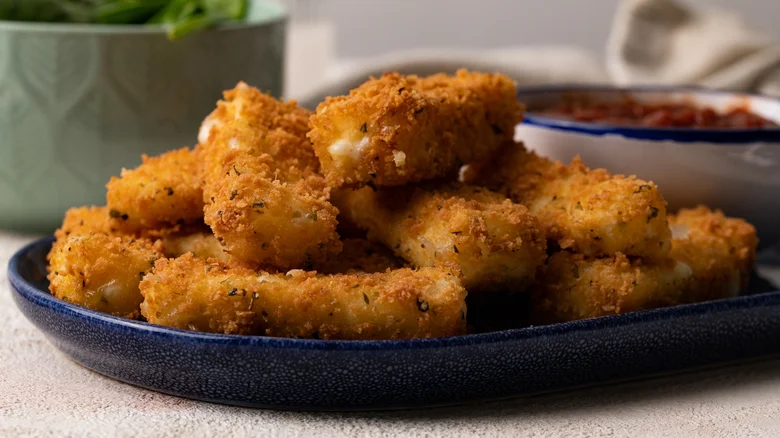 For the easiest handling, opt for a low-moisture mozzarella that you can chop into rectangles and dip into flour, beaten eggs, and breadcrumbs. However, there's no rule against using fresh mozzarella here. Many recipes call for fresh mozzarella, as the breadcrumbs tend to stick to it more readily, and the result tends to be even more ooey-gooey. But remember: Fresh mozzarella won't hold together as well, so tread carefully.