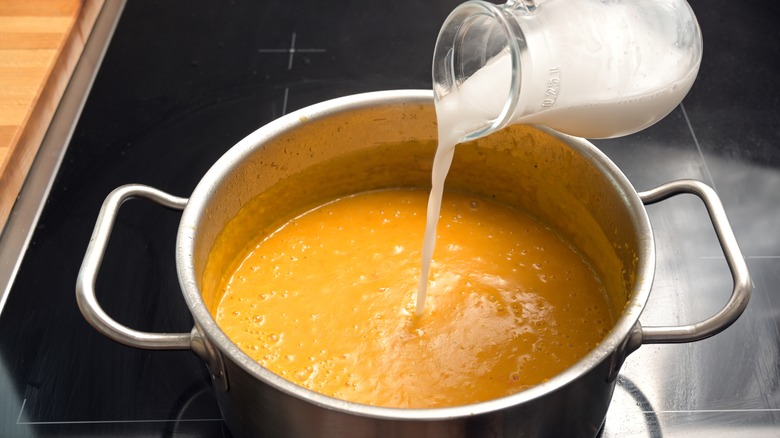 Full-fat coconut milk is a common substitute for heavy cream with an easy one-to-one substitution ratio. You'd add it to your tomato soup recipe the same way you'd add heavy cream, stirring full-fat coconut milk into a bubbling pot of aromatics, canned crushed tomatoes, and stock before blending it in a blender or hand emulsifier. For the ultimate thickness, you can use coconut milk instead of stock or water, with a two-to-one ratio of canned tomatoes to coconut milk.
