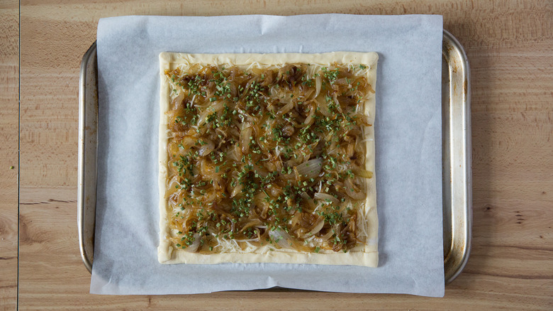 Deeply savory, buttery caramelized onions don't need much else besides a tart to shine, but melty cheese certainly helps.