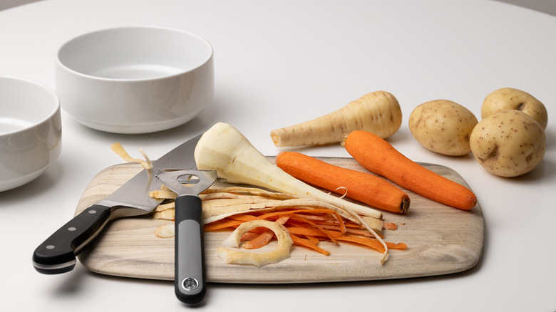 - After 1 hour, peel and cut the potatoes, carrots, and parsnips into roughly 1-inch chunks.