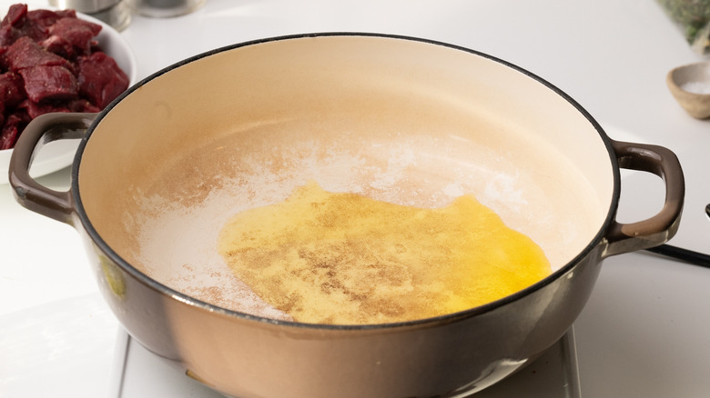 Return the venison to the pan along with the flour, and stir everything together.